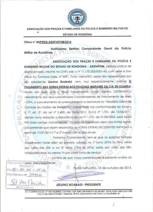 Nesta manhã (10), Jesuino Boabaid protocolou ofício ao Comando Geral da Polícia Militar de Rondônia, cobrando as horas extras pendentes dos policiais militares da CIA …
