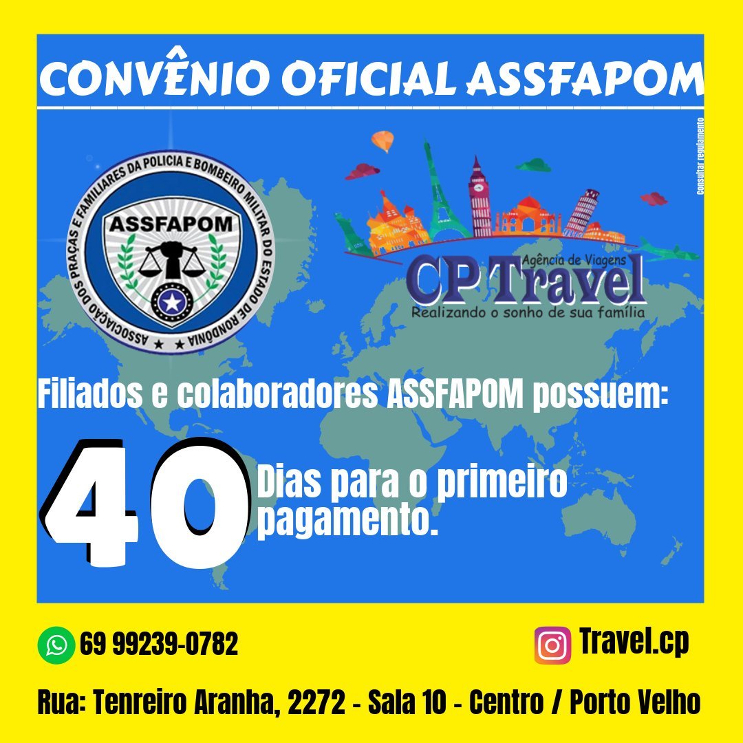 ASSFAPOM, através de seu Presidente, Jesuino Silva Boabaid, vem informar aos seus associados e seus dependentes legais,  que a entidade fechou uma parceria  com  a AGÊNCIA DE VIAGENS CP TRAVEL, que  está oferecendo  40 dias para o primeiro pagamento.