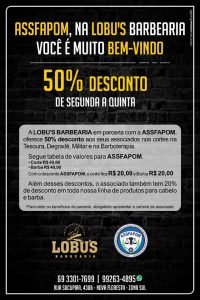 A ASSFAPOM fechou uma parceria com a Barbearia LOBU’S que oferece 50% de desconto de segunda a quinta-feira nos cortes na Tesoura, Degrade, Militar e na Barboterapia.