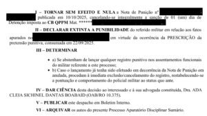 Segundo a sentença, quando ocorre a prescrição, o Estado perde o direito de punir. Isso significa que nenhuma punição pode ser executada, e qualquer ato administrativo nesse sentido passa a ser inválido. O juiz deixou claro que não pode haver prisão disciplinar, emissão de nota de punição, nem registro negativo na ficha funcional do policial.