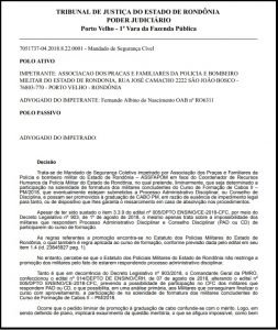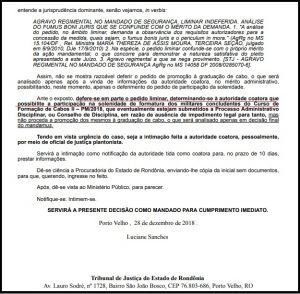 Na decisão, a Juíza Luciane Sanches, enfatizou que a promoção à graduação de cabo, será analisado apenas após a vinda de informações da autoridade coatora, no mérito administrativo,possibilitando, neste momento, apenas o deferimento do pedido de participação da solenidade.