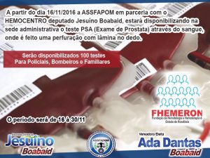 A Presidente Ada Dantas, da Associação dos Praças e Familiares da Polícia e Bombeiro Militar do Estado de Rondônia (ASSFAPOM) firmou parceria com o Deputado Estadual Jesuíno Boabaid (PMN) e com o HEMOCENTRO, para disponibilizar 100 exames de próstata para Policiais e Bombeiros Militares e seus familiares. A ação é para salientar a importância de se realizar o exame de próstata, mais ainda no mês de novembro, conhecido como “novembro azul”, de conscientização para os homens.