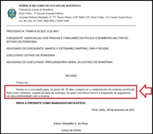 O presidente da ASSFAPOM- (Associação dos Praças e Familiares da PM e BM/RO), Jesuino Silva Boabaid, informa aos seus associados que assessoria jurídica responsável pelas demandas coletivas, Dr. Marcelo Estebanez e Dra. Lidiane, requereram a EXECUÇÃO PROVISÓRIA DA SENTENÇA na Ação Civil Pública de número 7006232-58.2016.8.22.0001, impetrada no dia 10/02/2016 pela entidade, decorrente a varias reclamações dos Policiais e Bombeiros associados, os quais tiveram seus vencimentos bloqueados por parte do Estado, causando prejuízos de natureza alimentar, nos exatos termos do 19.604 de 24 de março de 2015.