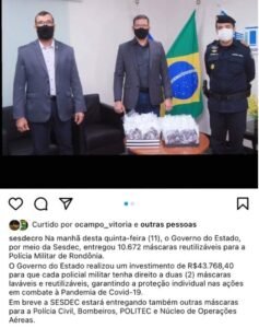 Conforme informou a Sesdec, cada policial militar receberá duas máscaras laváveis e reutilizáveis, para garantir proteção individual no combate à pandemia do Covid-19. No estado, quase 30 policiais militares já morreram em decorrência do Covid-19. A referida compra custou a bagatela de R$43.768,40 (quarenta e três mil, setecentos e sessenta e oito reais e quarenta centavos).