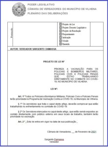 Nesta sexta feira (12), o presidente da ASSFAPOM Jesuíno Boabaid apresentou uma indicação de projeto de lei ao vereador do Município de Vilhena, Sargento Damasceno, que prioriza a vacinação para os policiais e bombeiros militares, policiais civis e policiais penais que estão trabalhando diretamente no combate do covid-19, no município de Vilhena.