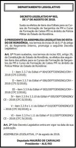 Foi publicado nesta quinta feira (02) o Decreto Legislativo 903 de 01 de agosto de 2018, de autoria do deputado Jesuíno Boabaid (PMN), que susta os efeitos de itens dos editais para os cursos de formação de sargentos da PM e curso de formação de cabos da Polícia Militar de Rondônia.