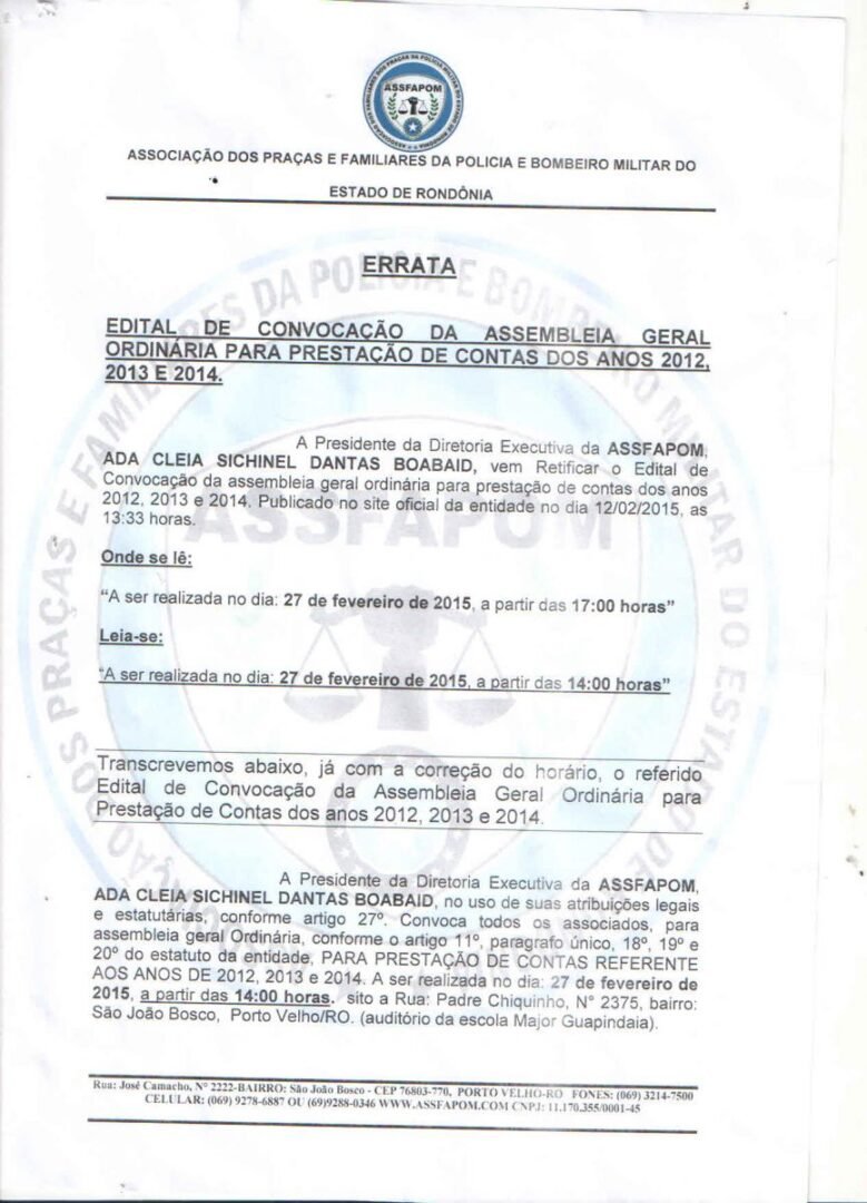 ERRATA ASSFAPOM- PRESTAÇÃO DE CONTAS SERÁ ÀS 14 HORAS DO DIA 27/02/2015 (SEXTA-FEIRA)