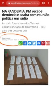 Todavia na noite de sexta-feira, 19/06/20, a Polícia Militar em São Felipe (RO) recebeu uma denúncia sobre uma reunião política em andamento que acontecia nas dependências de uma rádio do município.