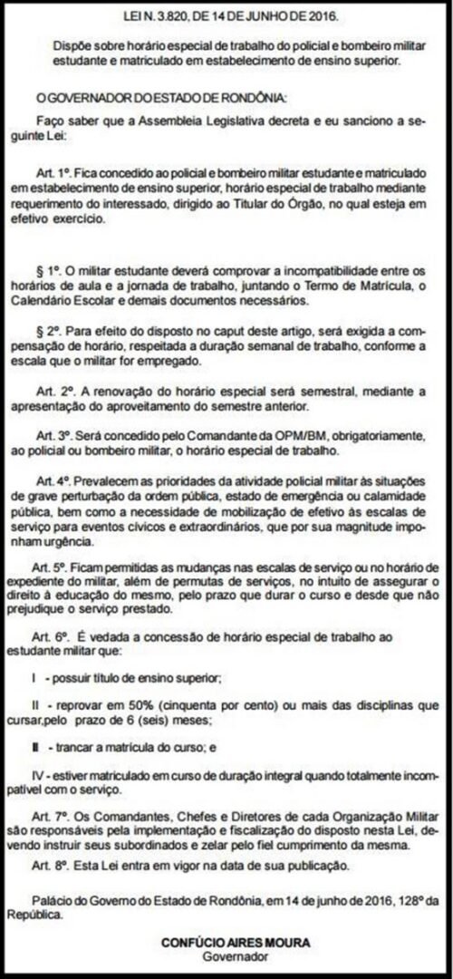 O Governador do Estado de Rondônia, Confúcio Moura (PMDB) sancionou a Lei que trata sobre o horário especial para Policiais Militares que estejam matriculados em estabelecimento de ensino superior. O Projeto de Lei (PL) é de autoria do Deputado Estadual Jesuíno Boabaid (PMN).