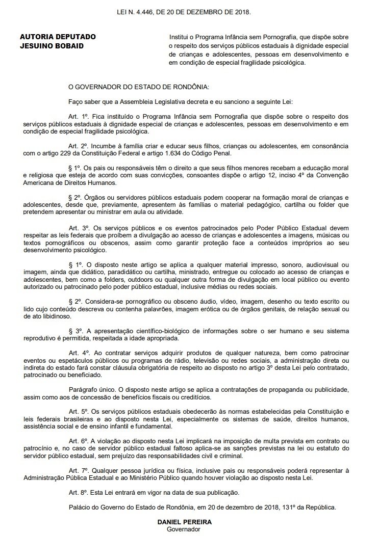 O Governador Daniel Pereira, sancionou a lei n. 4.446, de 20 de dezembro de 2018, do deputado Jesuíno Boabaid (PMN), que institui o programa ‘Infância sem Pornografia’, e dispõe sobre o respeito dos serviços públicos estaduais à dignidade especial de crianças e adolescentes, pessoas em desenvolvimento e em condição de especial fragilidade psicológica.