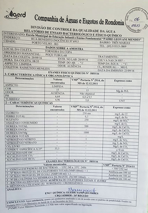 Poucos dias após a solicitação do Deputado, a CAERD realizou o exame de análise bacteriológica no poço da Escola, tendo o resultado sido satisfatório. Assinado pela Engenheira Química Eleide Sampaio Froes, o teste teve como conclusão: Água satisfatória, quanto aos parâmetros analisados e em acordo com os padrões de potabilidade fixados na Portaria 2914/11 do Ministério da Saúde de 12 de Dezembro de 2011.