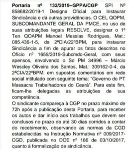 O militar alvo da censura pública e da Corporação é o soldado PM Márcio Wescley Oliveira dos Santos, destacado na 2ª Companhia do 22º BPM (Bairro Papicu). De acordo com a portaria do Comando-Geral, de número 132-219, o tenente-coronel Manoel Messias Rodrigues foi nomeado para apurar “os fatos”.