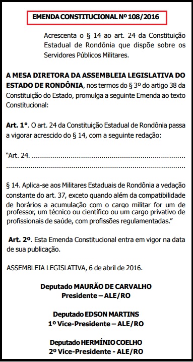 A Emenda Constitucional 108/2016, acrescentou o parágrafo 14 ao artigo 24 da Constituição Estadual de Rondônia, que ficou com a seguinte redação: “Aplica-se aos militares Estaduais de Rondônia a vedação constante do art. 37, exceto quando além da compatibilidade de horários a acumulação com o cargo militar for um de professor, um técnico científico ou um cargo privativo de profissionais de saúde, com profissões regulamentadas”.